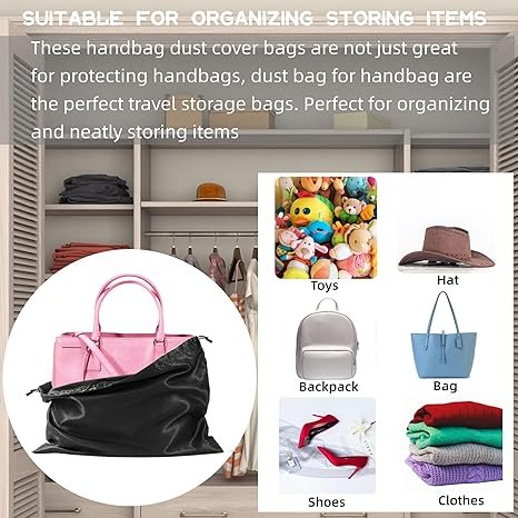 - 【MULTI-PURPOSE STORAGE BAG】These dust bags for purses are not only great for protecting handbags, The handbag storage organiser for packing can also be used for travel storage. Perfect for organising and neatly storing items for clothes, boots, shoes, accessories, cosmetics, toiletries, toys, small electronicsetc etc. It is also perfect for festivals, wedding, birthday drawstring gift bag, travel luggage organizer.