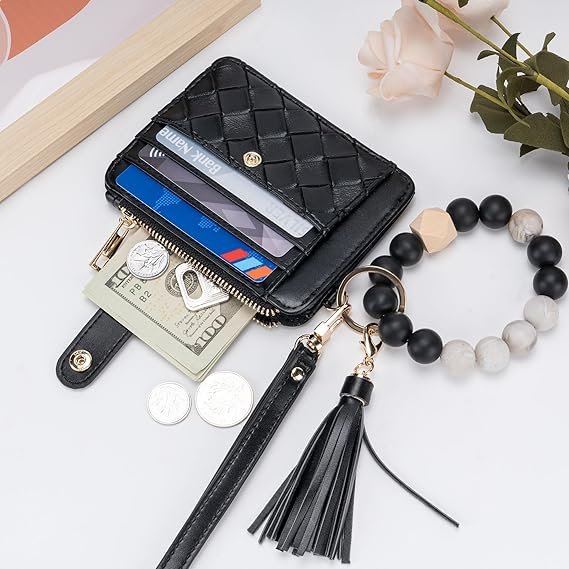 Keychain Wallet with Bracelet RFID Blocking Wristlet Credit Purse Card Holder, Silicone Bead Tassel Key Ring for Women