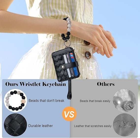 • COMFORTABLE & DURABLE:The silicone key ring bracelet is made from BPA-free silicone beads and a natural wooden bead. It features a detachable small wallet crafted from high-quality PU leather, complete with exquisite metal hardware and RFID-resistant fabric. This elegant and stylish wristlet purse is perfect for weddings, parties, proms, balls, and everyday use.